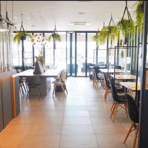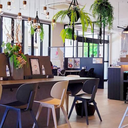 大きな窓から光が差し込む店内は、開放感のある雰囲気が特徴です。テーブル席やソファー席があり、少人数から大人数まで幅広い利用に対応。女子会やご家族でのお食事はもちろん、リモートワークや作業利用にもおすすめ。明るさと広さを兼ね備えた空間で、集中とリフレッシュを両立できる心地よい時間を過ごせます。